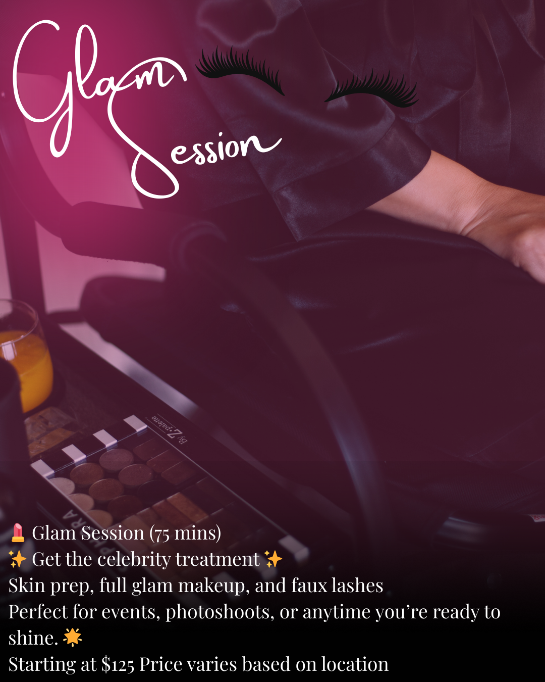 The ultimate celebrity treatment. I come to you, prep your skin, and create a full glam look that leaves you feeling pampered + unstoppable. Perfect for events, photoshoots, or anytime you want to shine.